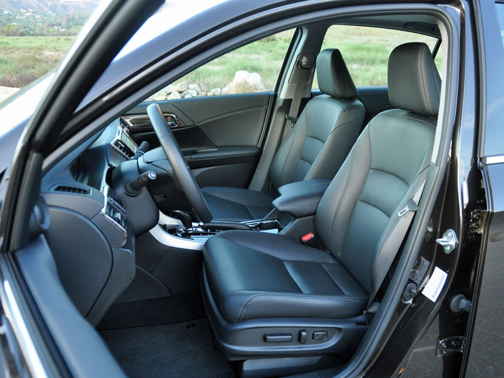 Thankfully, Honda decided not to install the touch-panel climate controls that mar the interior of the new HR-V crossover. In the Accord, the dual-zone automatic climate control panel has large, well-marked buttons and a clear display, in keeping with Honda’s historical penchant for flawless ergonomics. Big, legible instrumentation is another bonus, and a green ring glows around the speedometer whenever the car is driven in a fuel-efficient manner.