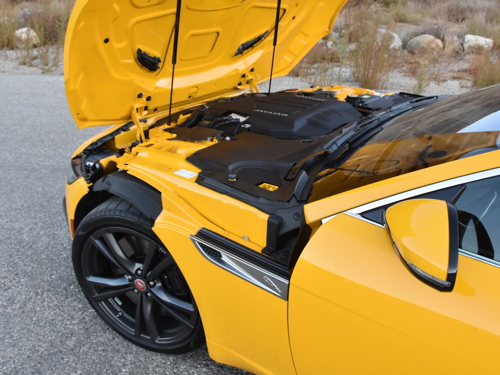 The Jaguar F-Type Coupe R we used for testing, in addition to the extra-cost Sorrento Yellow paint ($6,100), had optional 20-inch Satin Gray wheels, black brake calipers, a panoramic glass roof, a Meridian surround sound system, a Blind Spot Assist Package, and illuminated metal treadplates. The grand total came to $133,376 with MSRP and destination charge (Canadian, estimated).