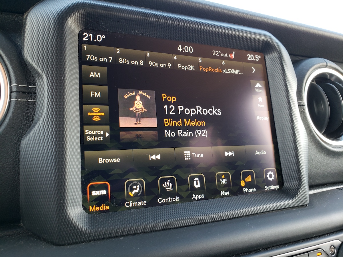 One of Uconnect’s best features is the volume and tuning toggles located on the back of the steering wheel, which can be adjusted with the driver’s index finger. Jeep’s off-road pages are also included that show information such as pitch and roll angle and geographic coordinates, and there are Hybrid Electric Pages for reviewing and adjusting settings related to vehicle efficiency.
