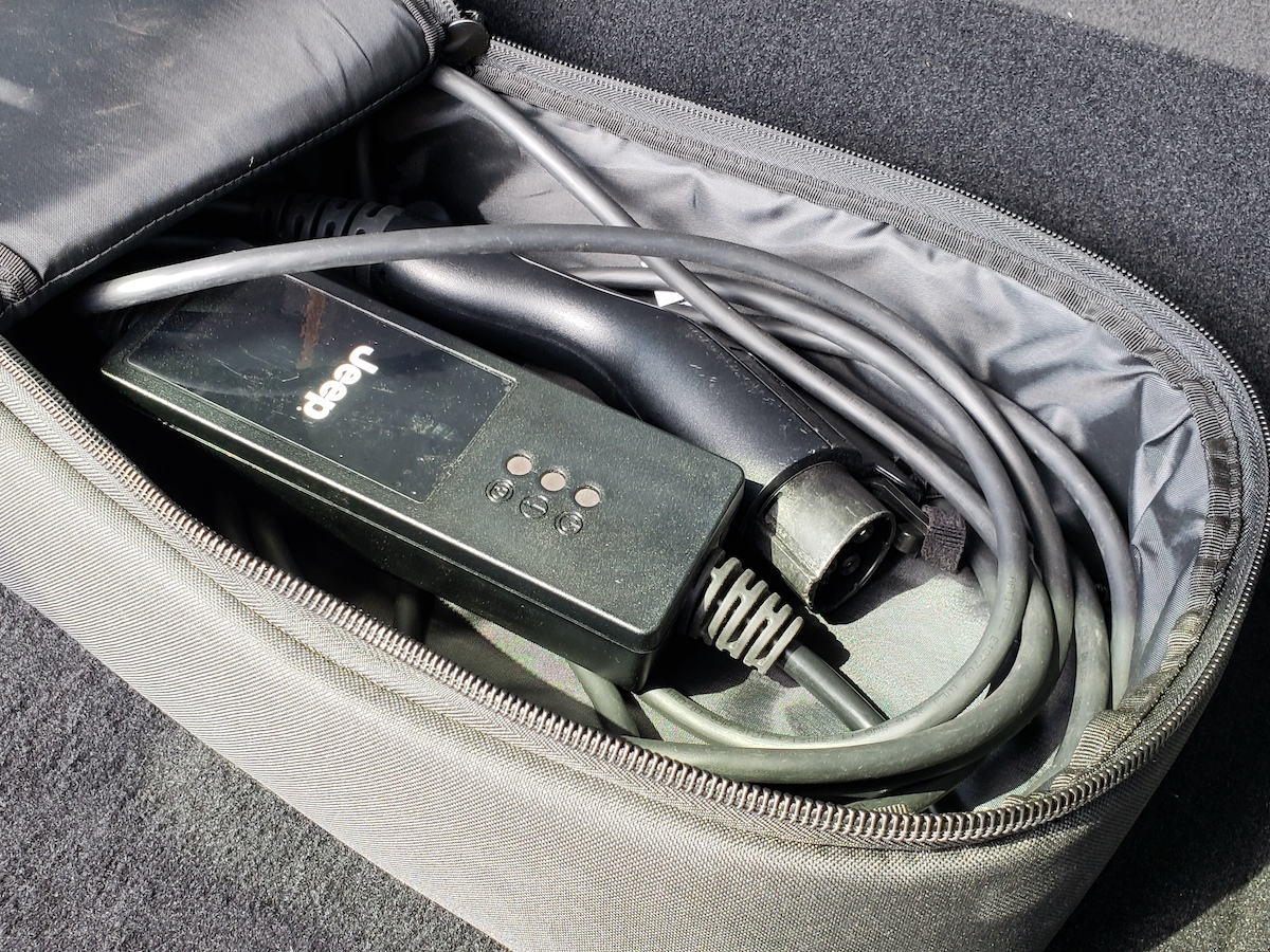 As plug-in hybrids go, the Wrangler 4xe is easy to manage. Some PHEV (plug-in hybrid electric vehicle) SUVs can be a tight squeeze in urban parking spots and driveways, but at a width of 1,875 mm, the Wrangler's body style is easier to manage than one might assume. A home charging cable is included and can be stored in the included zip-up storage bag that fits under the rear cargo load floor.
