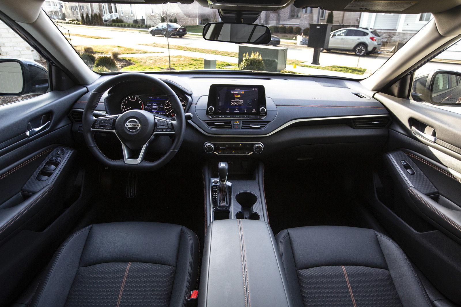 Inside the Altima, the dashboard is uncluttered and intelligently laid out. The standard 8-inch touchscreen display is mounted at the top of the centre stack—right where it should be for safety and convenience. The instrument panel is shrouded by a cowl, a very nice feature that makes it easy to read in sunlight while keeping glare from interfering with the driver’s view at night. The base Altima feels a little stripped-down, but as you move up the trim levels, interior materials improve, adding stitching to the dash and seats and better hand feel all around. It’s a real example of getting what you pay for.