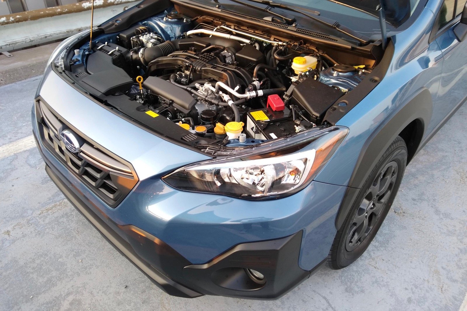 The boxer engine, with cylinders running parallel to the ground, is a Subaru trademark. It has a lower profile than the upright inline-four engines used in most other small cars, providing a lower centre of gravity that can improve handling. Granted, raising the ride height to create an SUV-like stance likely negates some of that benefit.