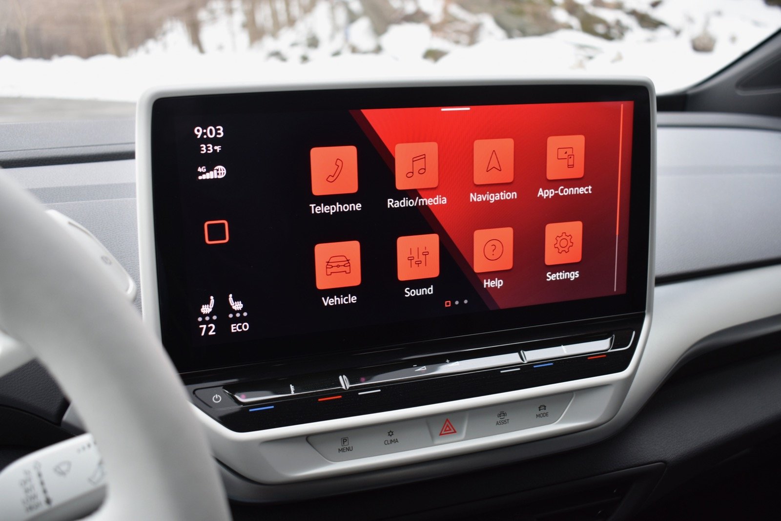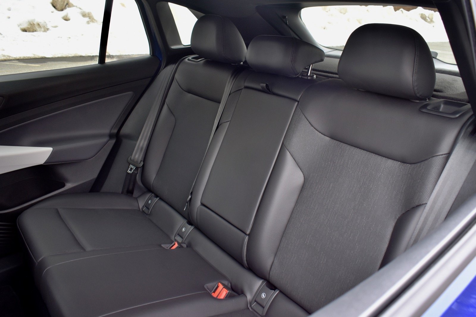 Maintaining cabin heat in electric cars can be a challenge because there’s no internal-combustion engine to act as a heat source. So VW made a heated steering wheel and front seats standard, as applying direct heat to the body is more efficient. That proved effective during our northern and snowbound mid-February test drive. The seats themselves had a good amount of cushioning, but the driver’s seat lacked thigh support, forcing the driver to sit in an uncomfortable splay-legged position.
