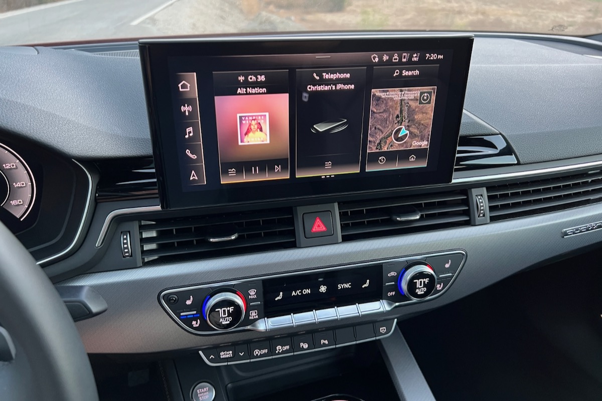Features include Bluetooth, wireless Apple CarPlay and Android Auto, SiriusXM satellite radio (with a complimentary 90-day subscription), and Audi Connect connected services (free for six months). The test car also had a navigation system, wireless smartphone charging, and a 19-speaker Bang & Olufsen premium audio system.