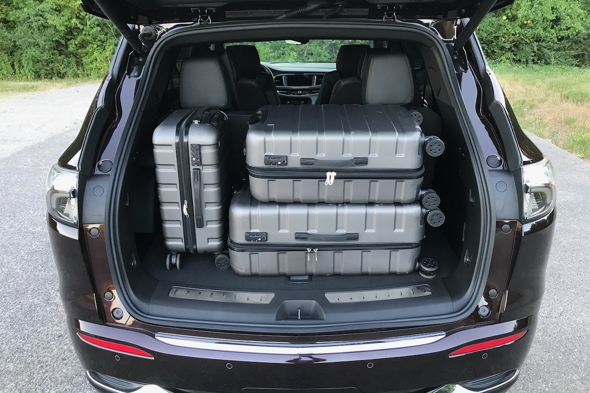 In addition to a spacious passenger cabin, the Enclave offers ample storage behind the third row of seats. Cargo room behind the standard hands-free liftgate with all seats up measures 668 litres—plenty of room to accommodate a full set of three rolling suitcases, which not all midsize SUVs can do. Fold the third row and you have 1,634 litres of cargo space with which to work. Fold both rows and there's a voluminous 2,758 litres. Our test vehicle featured power-folding third-row seats, which makes it even easier to access all that cargo space.