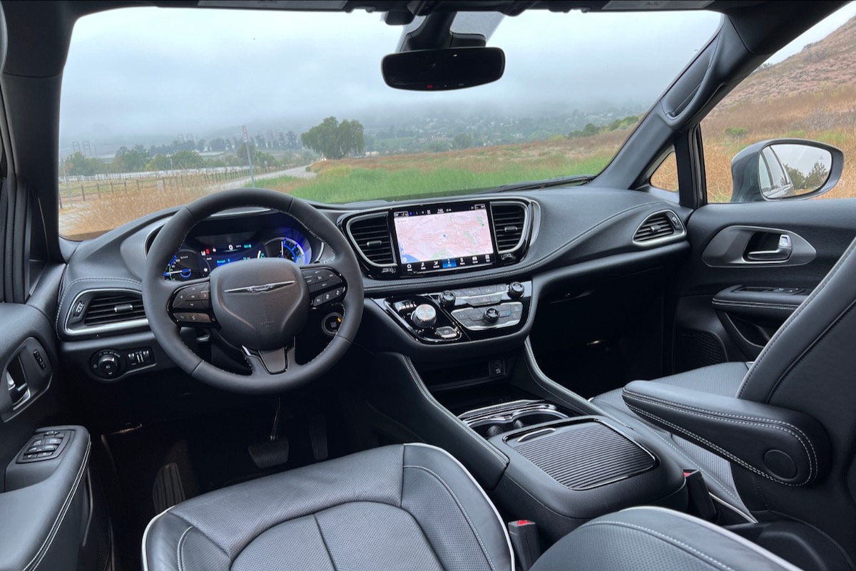 Equipped with triple-zone automatic climate control with a new clean air filtration system, quality leather upholstery wrapped around comfortable front seats, and heated and ventilated front-seat cushions, the Pacifica Hybrid Limited easily kept its cool during a mid-summer heat wave—especially if we kept the panoramic sunroof’s shade closed. A heated steering wheel is equipped from Limited to help in the winter. Chrysler also pads the sides of the centre console so that the driver and front passenger remain comfortable on long road trips.
