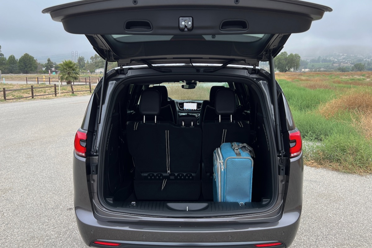 Behind the third-row seat, the Pacifica Hybrid provides 914 litres of cargo space. Plastic grocery bag hooks run the width of the cargo well, and Chrysler places the power liftgate close button low so that shorter people can easily reach it. The Pacifica Hybrid does not offer an onboard vacuum cleaner like other Pacifica models; that panel in the cargo area contains the minivan’s charging cord and storage bag.