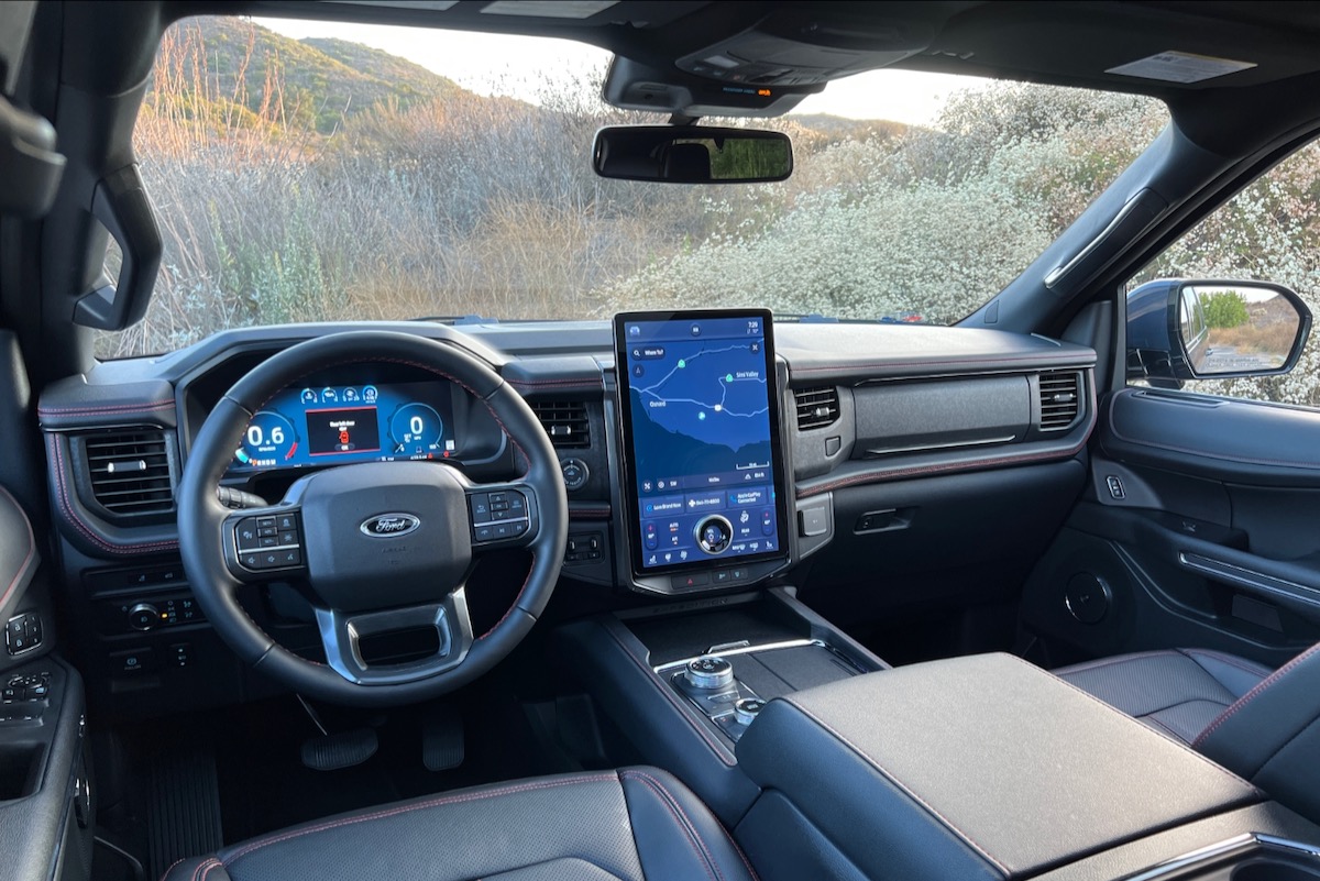 Inside, a redesigned dashboard houses the Expedition’s new Sync 4 and Sync 4A infotainment systems, the latter featuring a huge 15.5-inch touchscreen display mounted in portrait orientation. The SUV also offers an available 12.4-inch digital instrumentation display, which our leather-lined Limited Stealth Edition had.