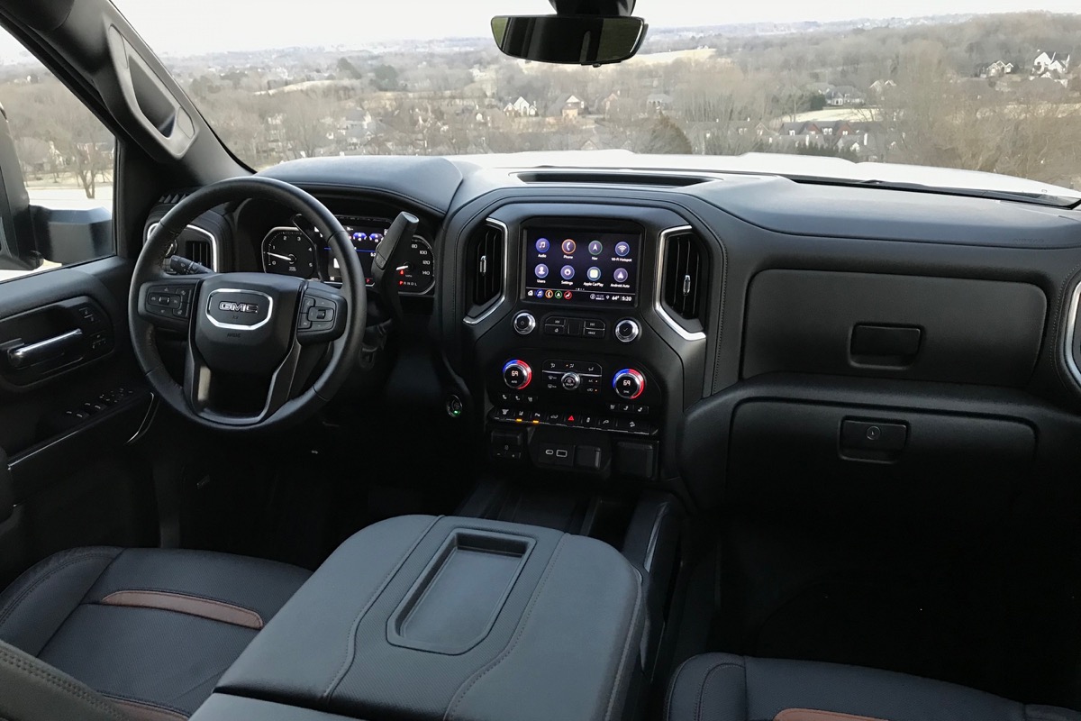 We drove the off-road-focused AT4 trim for this review. Our test truck featured black chrome accents, C-shaped LED lighting, a hood air-induction system, red recovery hooks, 20-inch wheels with high gloss black accents, and the optional high-clearance step. Inside, the AT4 had Jet Black with Kalahari upholstery and embroidered AT4 accents, heated and ventilated perforated leather front seats, a leather-wrapped heated steering wheel, premium front and rear floor liners with removable carpet inserts, premium GMC infotainment system, a wireless charging pad, and a Bose premium sound system. Altogether, the AT4 is a rugged, handsome package befitting a luxury off-roader.