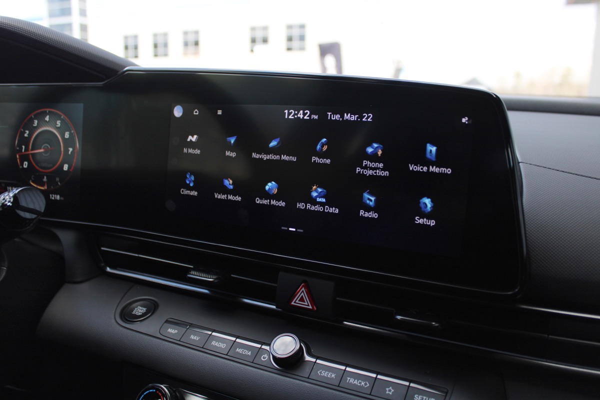 If you want sport-infused dynamics and a high level of technology, you opt for the Elantra N and not the Elantra N Line. In the Elantra N, the digital instrument cluster and infotainment touchscreen are both 10.25 inches. Neither are available in the lower Elantra trims, which get a 4.2-inch driver information panel and an 8-inch touchscreen. Only the Elantra N Line Ultimate can be equipped with the larger screens. Cloud-based navigation is included.