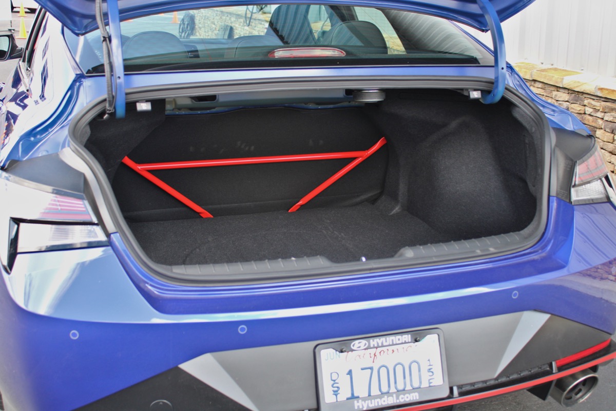 If there are any demerits in terms of practicality, they would be in the trunk. The Elantra N is the only Elantra that does not come with a spare tire. Instead, you get a tire mobility kit and access to roadside assistance. The cargo space is still 402 litres but with the rear bench folded down, the total usable space can become tricky. That’s because the rear strut tower brace is located directly behind the rear seats. It’s an important performance feature for additional body reinforcement but it also literally gets in the way of using the full cargo capacity of the sedan. Loading long items will be an issue if they cannot fit between the bars of the bright-red chassis brace. Four-by-fours, curtain rods, and the like will fit fine. But for something large and wide like a flatscreen TV or furniture from IKEA, you’ll need to phone a friend.