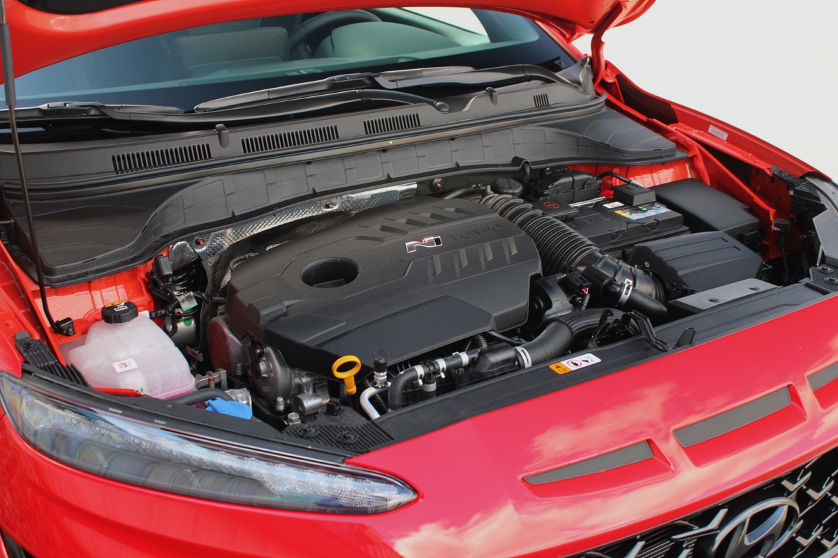 The N Brand logo also makes an appearance on the shift knob, steering wheel spoke, and front bucket N sport seats. The sport-fashioned upholstery is leather with suede inserts in both the front and rear for added comfort and support during exuberant driving (which is guaranteed to happen). While the Hyundai Kona N design hints at a sporty characteristic, the vehicle truly boasts its worth with what lies underneath the hood in addition to modifications made to the body, chassis, and suspension.