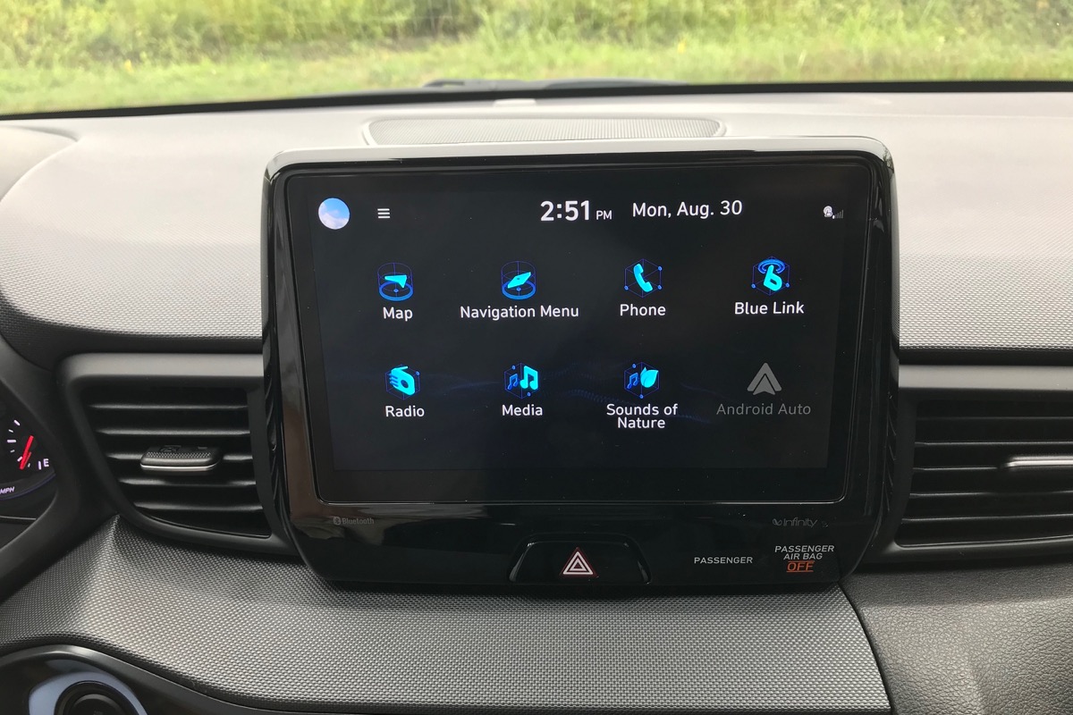 Standard features include an 8-inch touchscreen with navigation, Bluetooth smartphone integration with voice recognition, Apple CarPlay and Android Auto, and three USB chargers. Standard audio is an Infinity eight-speaker system (including subwoofer) with SiriusXM satellite radio, HD Radio, and an auxiliary input jack. While the system provides decent sound, it's a clear step down from the premium Bose 12-speaker audio system found in other Hyundai models.