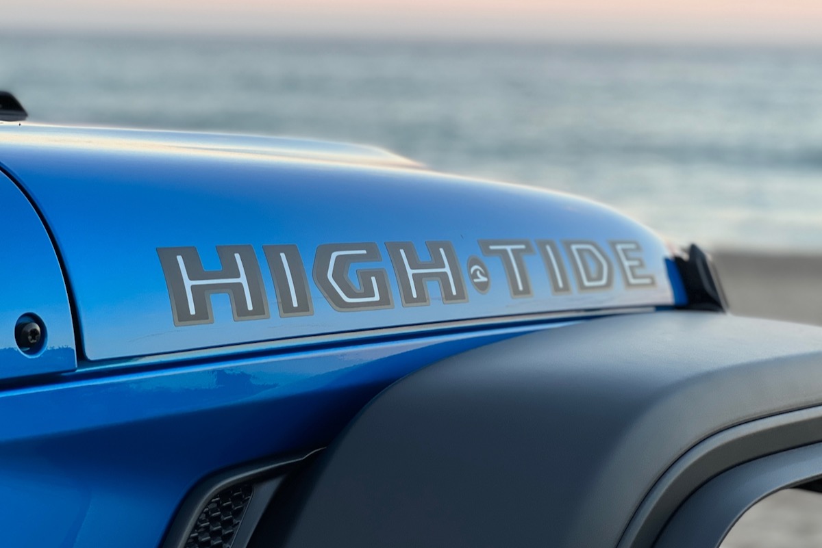 Our test vehicle was the new High Tide model. This US-market special edition is not sold in Canada, but it’s based on the Jeep Wrangler Unlimted (four-door) Sport S trim and adds a few options, most of which are available in Canada: LED exterior lighting, a body-colour hardtop with a Sunrider Fliptop (a fabric section of roof over the front seats; the black and tan versions are available in Canada), a Gorilla Glass windshield upgrade, floor mats, and hood decals. Unfortunately, the Xtreme Recon package that adds capability to this model is not offered with this configuration in Canada.