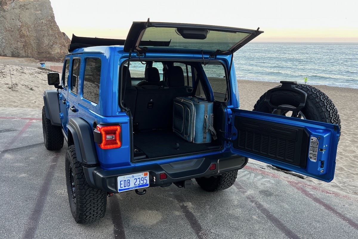 Rear-seat passengers experience the same entry and exit difficulties as the people in front, compounded by the intrusive rear wheel wells and narrower door openings. Once they’re aboard, however, two adults will find agreeable accommodations with a good view out. There are air conditioning vents, cupholders, and large grab handles for the second row, but the speakers embedded into the Wrangler’s overhead roll bar are essentially right in their faces.