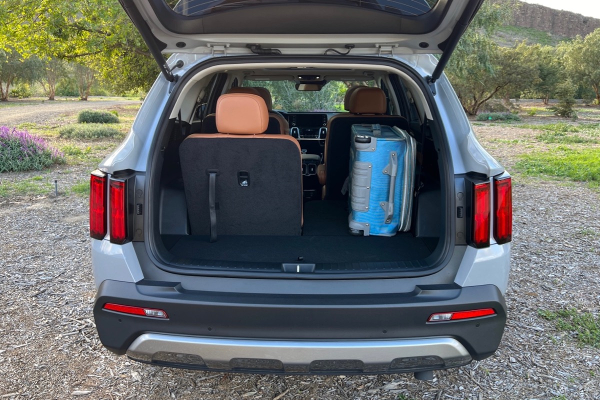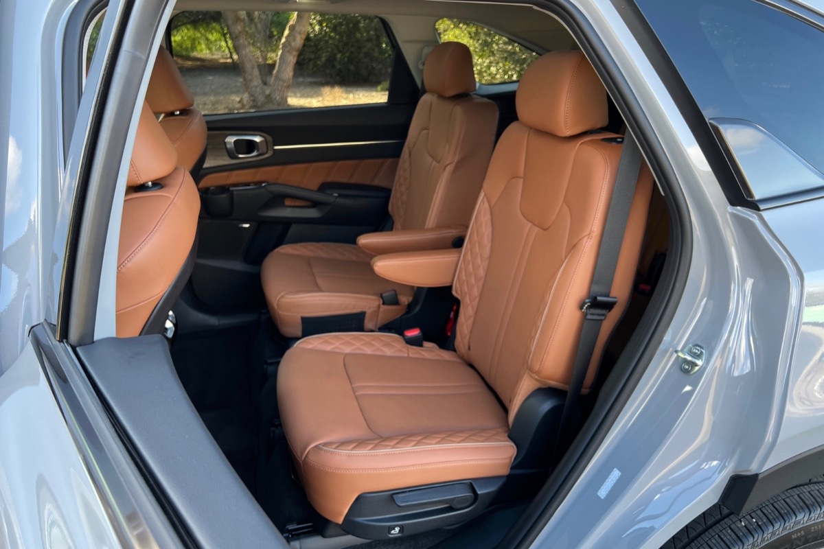 Second-row captain’s chairs are standard starting with the Sorento EX trim and are heated in the EX+ and SX. Kia clearly designed this area for kids, including cupholders molded into the door armrests, USB charging ports, rear climate control vents, dual storage pockets on the front seatbacks, and other handy storage solutions. Additionally, the Sorento’s available panoramic sunroof extends clear over their heads. Oh, and the seats are comfortable, too.