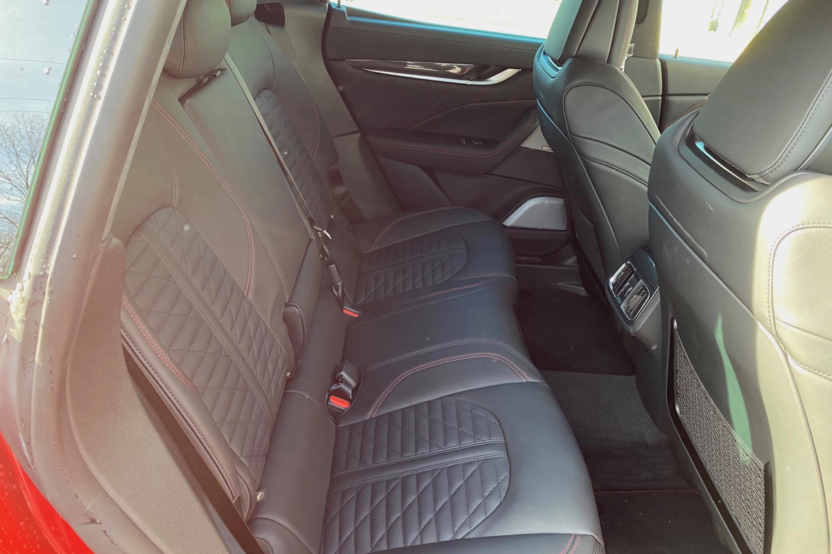 The Levante’s front seats are very comfortable, and leather is standard, with quality upgrades as the trim levels rise. Modena S and Trofeo models have heated and ventilated front seats with massage function, which is great on long drives.