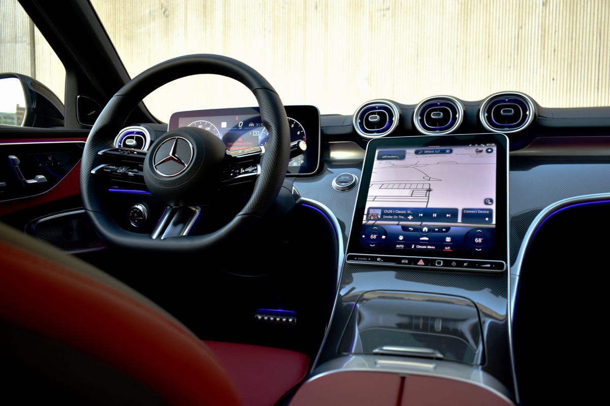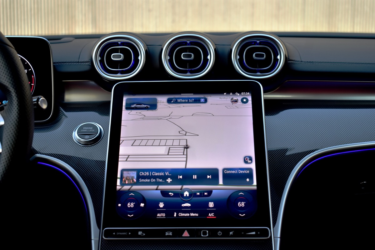 The MBUX (short for Mercedes-Benz User Experience) infotainment system is familiar from other recent Mercedes models. The C-Class also borrows the “Zero Layer” setup from the Mercedes EQS electric car, which allows multiple items to be displayed on the screen at once. Instead of scrolling through menus, functions like audio and phone connectivity appear as tiles, with the navigation map as a background. Climate controls are placed in a separate menu bar below.