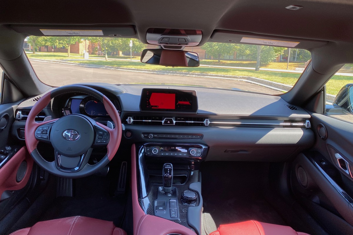 Perhaps we've grown jaded by big touchscreen displays, but the Supra's landscape-oriented setup induced frustration, especially when using the native navigation function. Once the system applied split-screen and automatic zooming functions, following our vehicle's progress on the display was quite challenging. Using Apple CarPlay with our iPhone 11 Pro remedied this somewhat, but the screen still felt too small. Also, you can't get Apple CarPlay on the base system. Help, aftermarket!