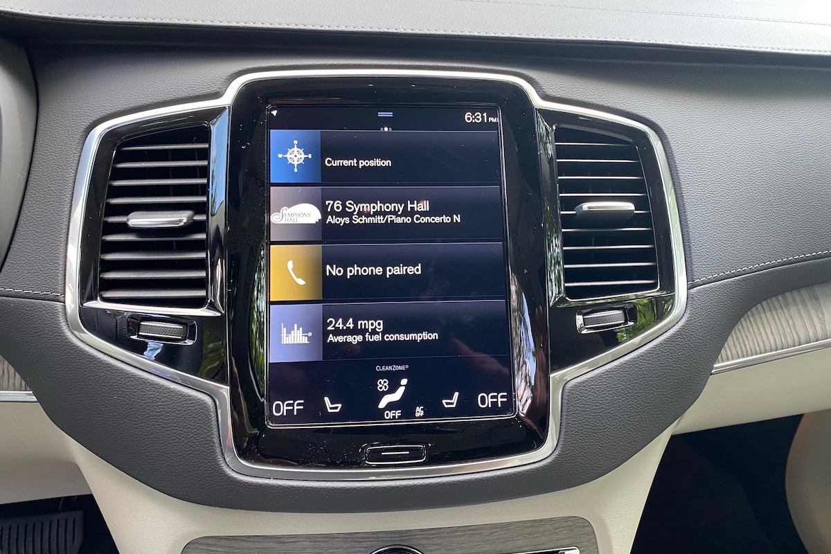 Volvo's Sensus infotainment system was among the first, after Tesla, to bring tablet-like functionality to the touchscreen interface. Familiar smartphone or tablet gestures, like pinch, pull, and swipe, make the system intuitive to tech-savvy users, and Bluetooth functionality is standard. Unfortunately, we found the system in our test car to be a bit glitchy and slow to respond, almost like it was overwhelmed with input. The system worked better when we connected an iPhone 11 Pro and used the Apple CarPlay functionality. We did not test Android Auto, but the XC90 has that capability.