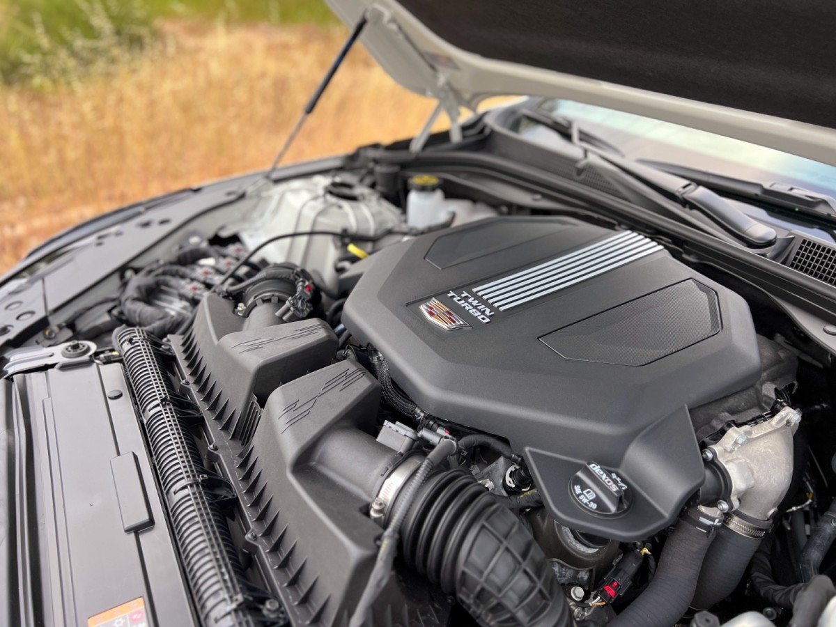 A twin-turbo 3.0-litre V6 engine lives underneath the Cadillac CT5-V’s hood, producing power specs of 360 horsepower and 405 pound-feet of torque. That’s more than you get from the base engines in the A6, 5 Series, and E-Class but less than you’ll find in a BMW M340i or Mercedes-AMG C 43.