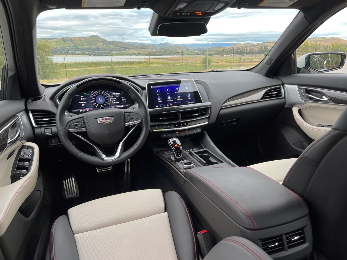 In the CT5-V, standard artificial leather wraps the standard 18-way power-adjustable front performance seats. Genuine leather is optional, as are ventilated front seats. In Canada, heated front seats and a heated steering wheel are standard on all CT5s. Cadillac delivered the test vehicle with deflated seat bolsters, so the seats felt flat and featureless. However, when you inflate the bolsters, adjust the lumbar, extend the thigh support, and move the power tilt-and-telescopic steering wheel into a proper position, the CT5-V provides good comfort for cruising and adequate support for enthusiastic driving.