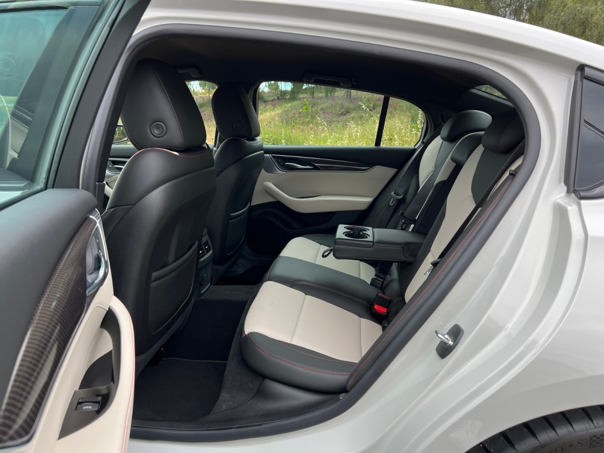 Once settled in, the CT5-V’s rear seat is reminiscent of a BMW 3 Series. You enjoy a slightly reclined backrest position paired with an angled lower cushion that provides excellent thigh support. Knee clearance is decent, and the Cadillac offers good foot room. But the BMW likeness ends with the CT5-V’s cheap-looking plastic front seatback panels, which scuff too easily.