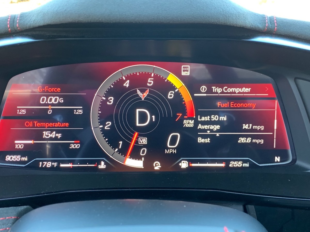 The Corvette features a fully digital instrument panel that changes themes with each drive mode. The more high-performance drive modes get a more focused, simplified screen. The Tour mode features more general information for the driver. This is echoed in the helpful head-up display.