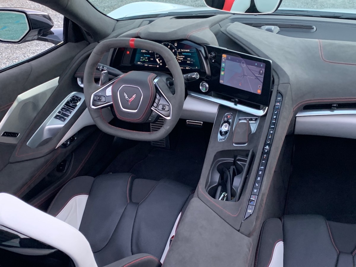 As mentioned, the Corvette’s standard 8-inch touchscreen protrudes inorganically from the dash, but that’s to the driver’s benefit. The screen is tilted towards the driver and features Chevy’s Infotainment 3 system that’s similar to that found in Buick and GMC vehicles. In addition to Bluetooth, OnStar capability, and wireless Apple CarPlay and wireless Android Auto connectivity, it has a logical menu layout. The icons are large and easy to read. On the upper-left corner of the screen, a volume dial and a Home button make navigating this system a snap.