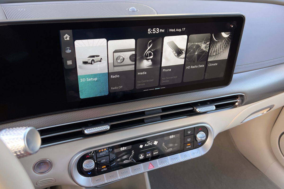Genesis marries two 12.3-inch displays under a single piece of glass to create the GV60’s digital instrumentation and infotainment panels. The infotainment display is a touchscreen, and both offer outstanding graphics and an intuitive user experience.