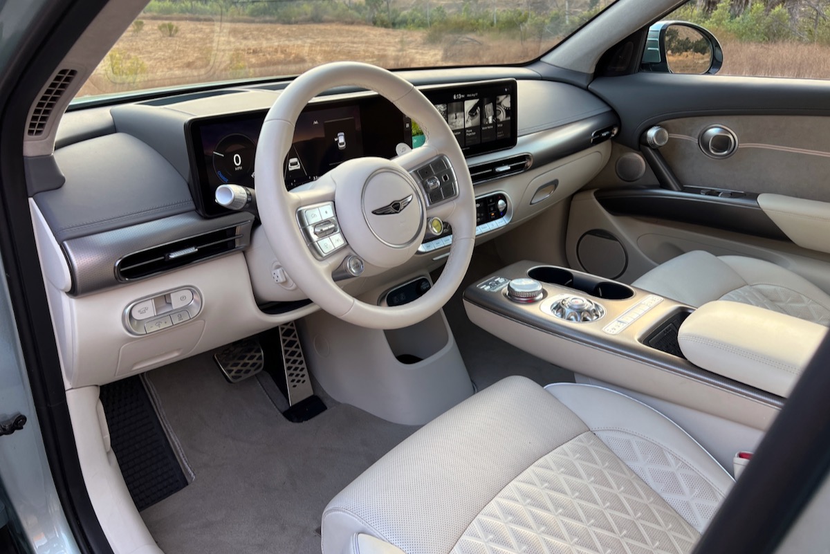 Open any door, and the GV60’s elegance, craftsmanship, and high-tech features are instantly evident. Our Genesis GV60 Performance test vehicle’s cabin was decked out in an Ash Gray over Glacier White colour scheme, and featured diamond-stitched Nappa leather upholstery, artificial leather on the dashboard, and simulated suede on the door panels and headliner. Diamond-pattern aluminum pedal covers and metallic trim complemented the interior’s vaguely retro rounded shapes and thoroughly modern digital instrumentation and infotainment screens. If there is a misstep here, it’s the silver plastic on the door panels that creaks under pressure, making it sound and feel cheap. The saving grace, however, is that this is likely up-cycled material, adding sustainability cred to the car.
