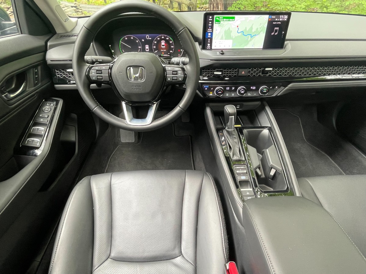 The standard non-hybrid Accord is fitted with a 7-inch touchscreen display and 10.2-inch digital instrument display. Stepping up to the Accord Hybrid brings the same digital gauges, though it upgrades the infotainment system to a 12.3-inch touchscreen. It took us only a few minutes to get familiar with the commands and intuitive menus. The graphics are easy to navigate and with the Touring trim you get all the available tech touches Honda offers on the Accord. This goes some way to justify splurging on this range-topping trim. We were happy to see the physical volume knob and climate control buttons when we first drove the Accord early in 2023, but this time around, it was the advanced tech features that caught our eye.