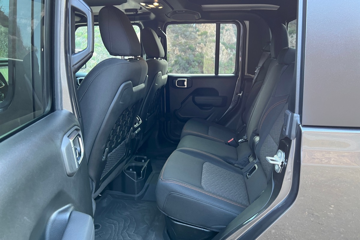 The rear seats are roomy enough for adults, and Jeep equips the Gladiator with a supportive bottom cushion, good legroom, and rear air conditioning vents. However, the use of plastic front seatback panels with grocery bag hooks, storage netting, and MOLLE-style loops means taller passengers will likely feel some knee and shin pain.