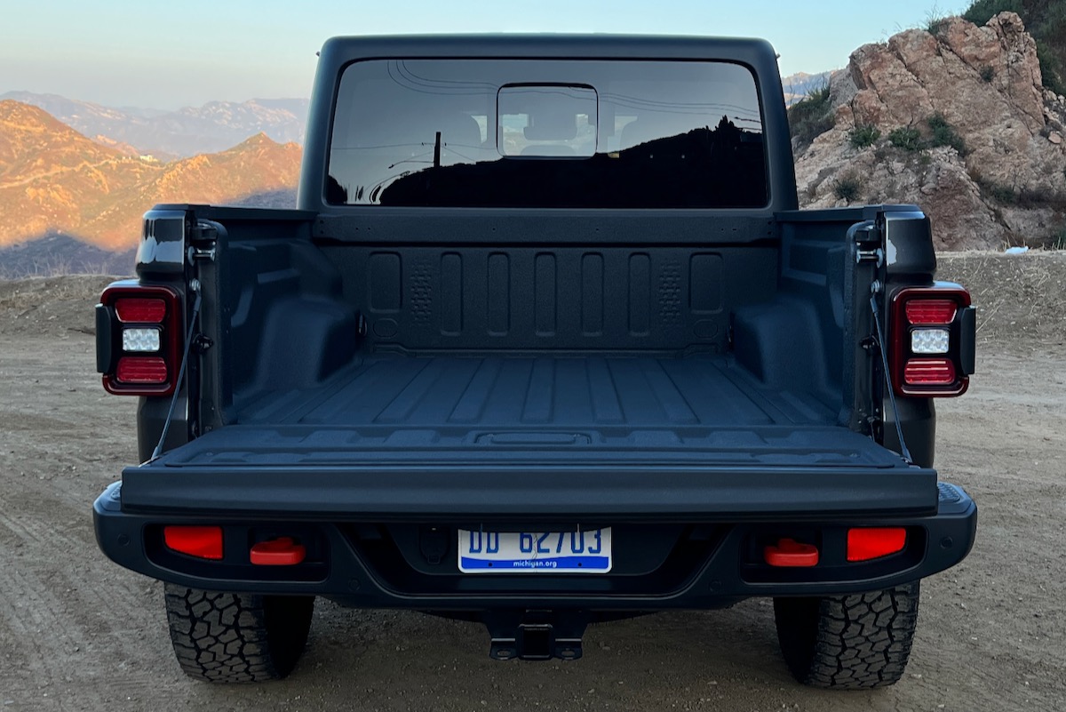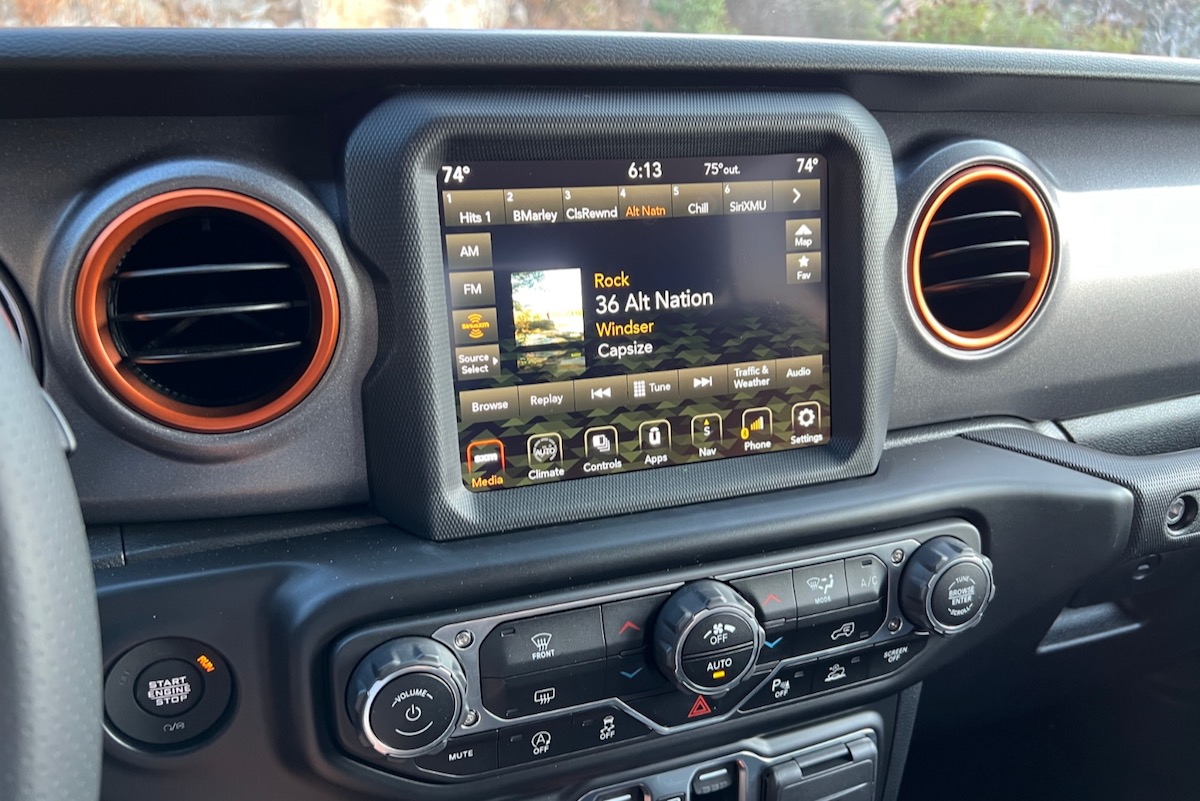 Additional tech on our test vehicle included a passive keyless entry system that recognizes the presence of the key fob and allows you to open the door by pushing a button on the handle. Also, the dual-zone automatic climate control system has an air filter that Jeep says can eliminate 95% of all particulates in the cabin. Considering how often Gladiators are driven open-air style, this is rather amusing.