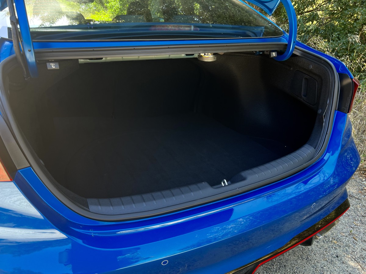 Behind the rear seats, the trunk can hold up to 433 litres of cargo. That's slightly more cargo space than the Honda Civic and Mazda 3 sedans, but the hatchback versions of those can hold between 569 and 693 litres. The cargo floor has a flimsy fabric covering that seems out of place when everything else is adequately sturdy, but the space itself is notable for its height. You can load much bulkier items than the typical sedan and if you need more space, remote seatback releases make it that much easier.