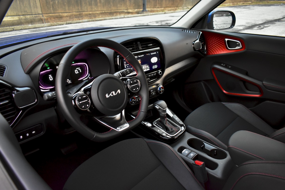 While the exterior is defined by hard angles, the interior is defined by curves. The infotainment touchscreen sits in an ovoid housing, with a shape echoed by the dashboard speaker grilles. Our GT-Line Limited test car added some welcome pops of colour to the mostly black interior, including red contrast stitching and red trim for the doors, which also have large scalloped elements that add more flair to the interior. Little touches like these make the Soul feel like more than an entry-level car.