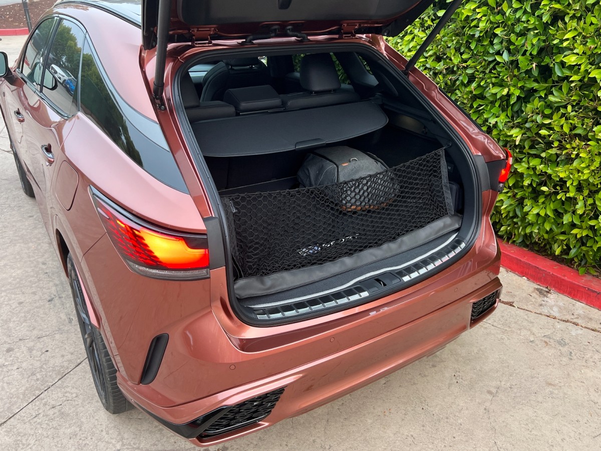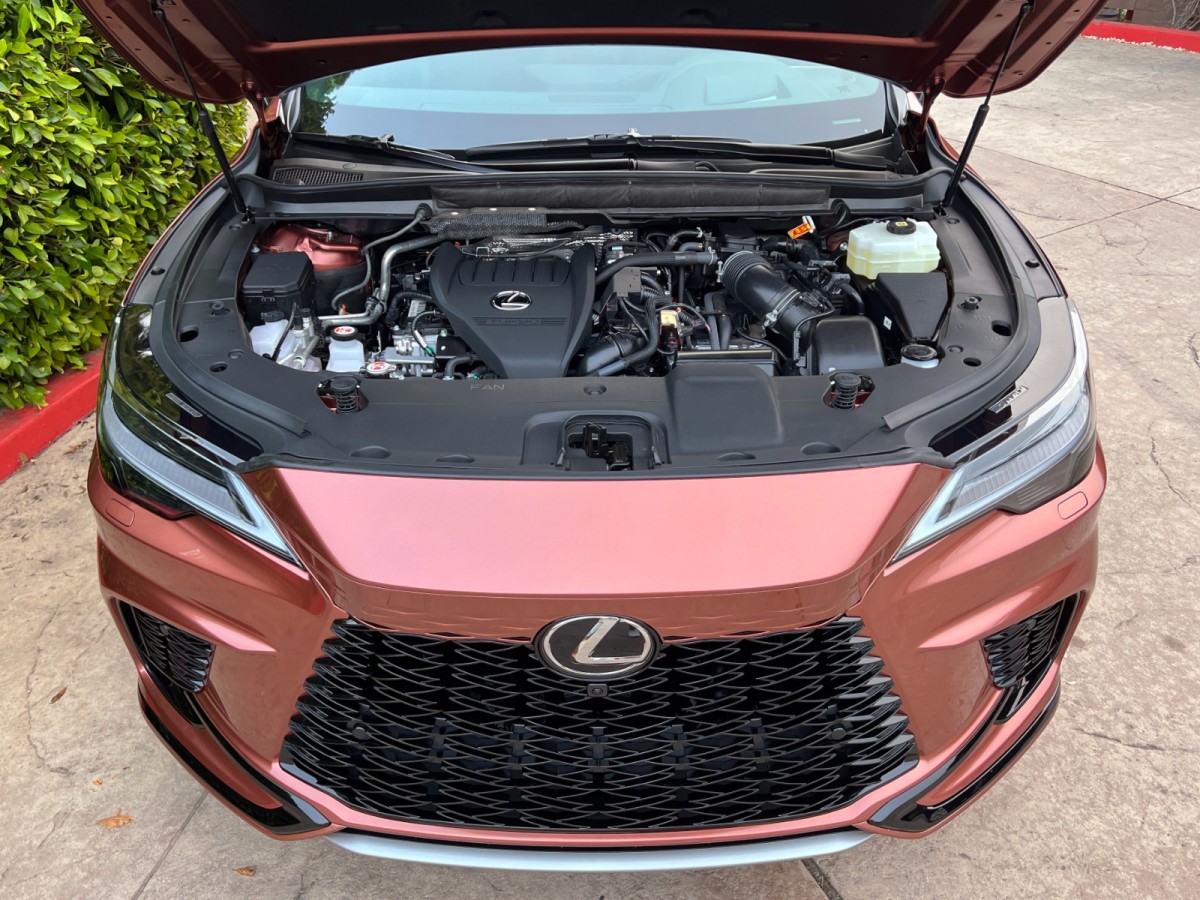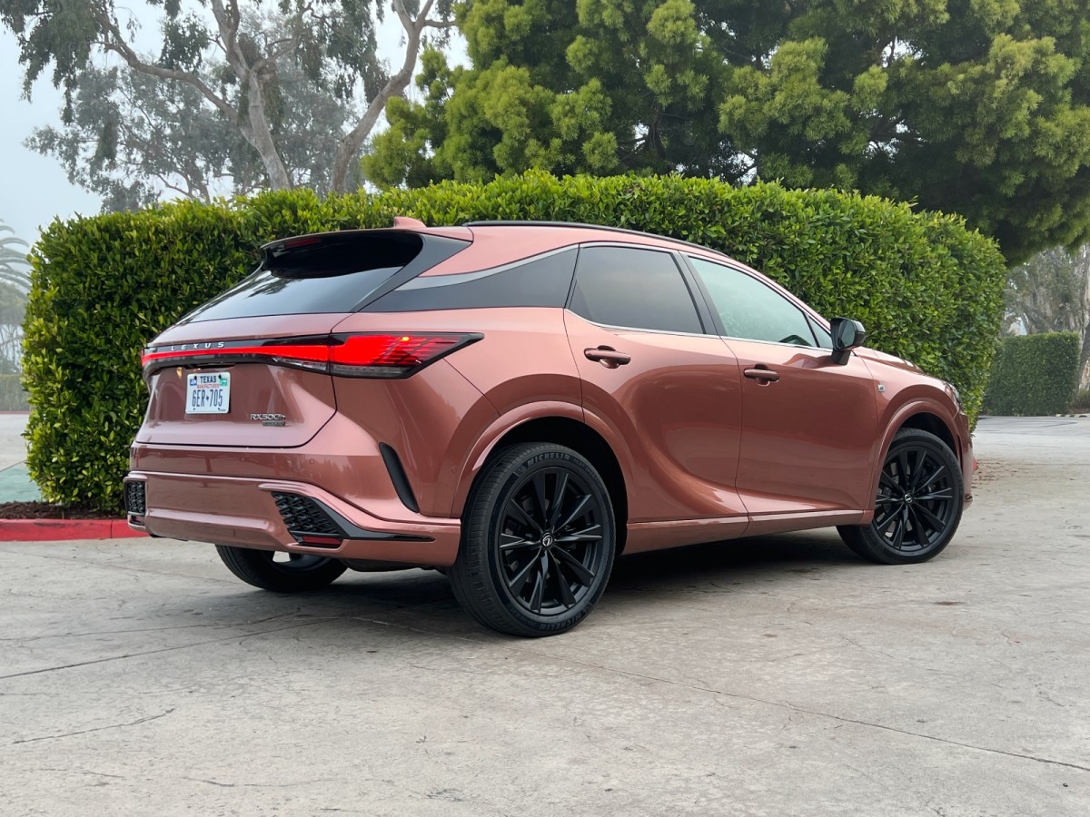 The RX 500h F Sport Performance test vehicle did visually distinguish itself, and not just because of its Copper paint job. This is a performance-tuned version of the SUV, and it looks the part with a blacked-out grille and exterior styling details, matte-black 21-inch wheels, more aggressive bumper designs, and specific interior trimmings.