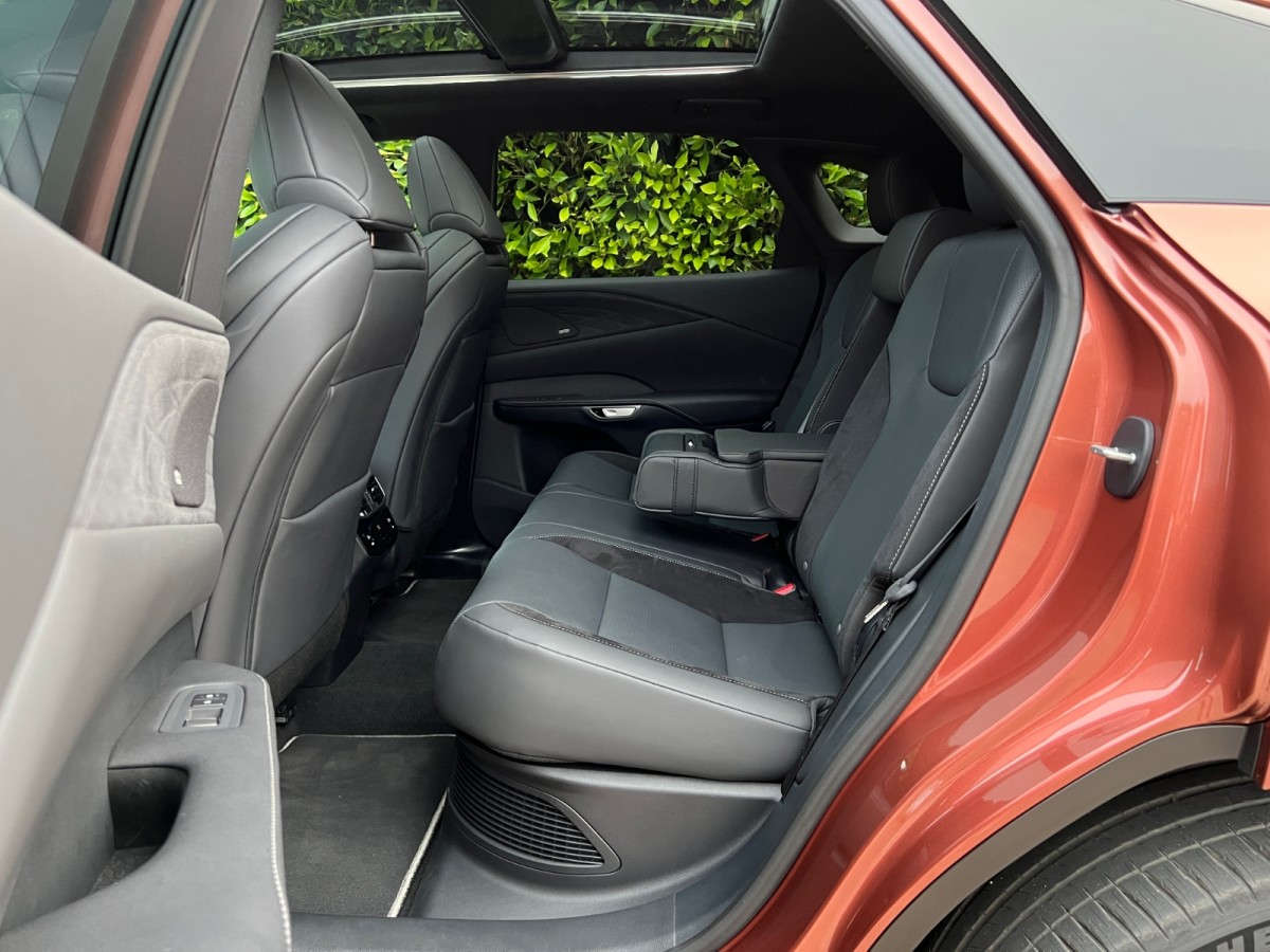 Lexus houses the hybrids’ battery packs underneath the back seat. This forces placement of the seat cushion a little higher in the vehicle, and the new RX has a lower roofline than it did before. The result is excellent leg support for rear passengers, combined with good legroom and space for feet. However, rear headroom is tight. A panoramic moonroof is standard on the RX 500h and available on lower trims.