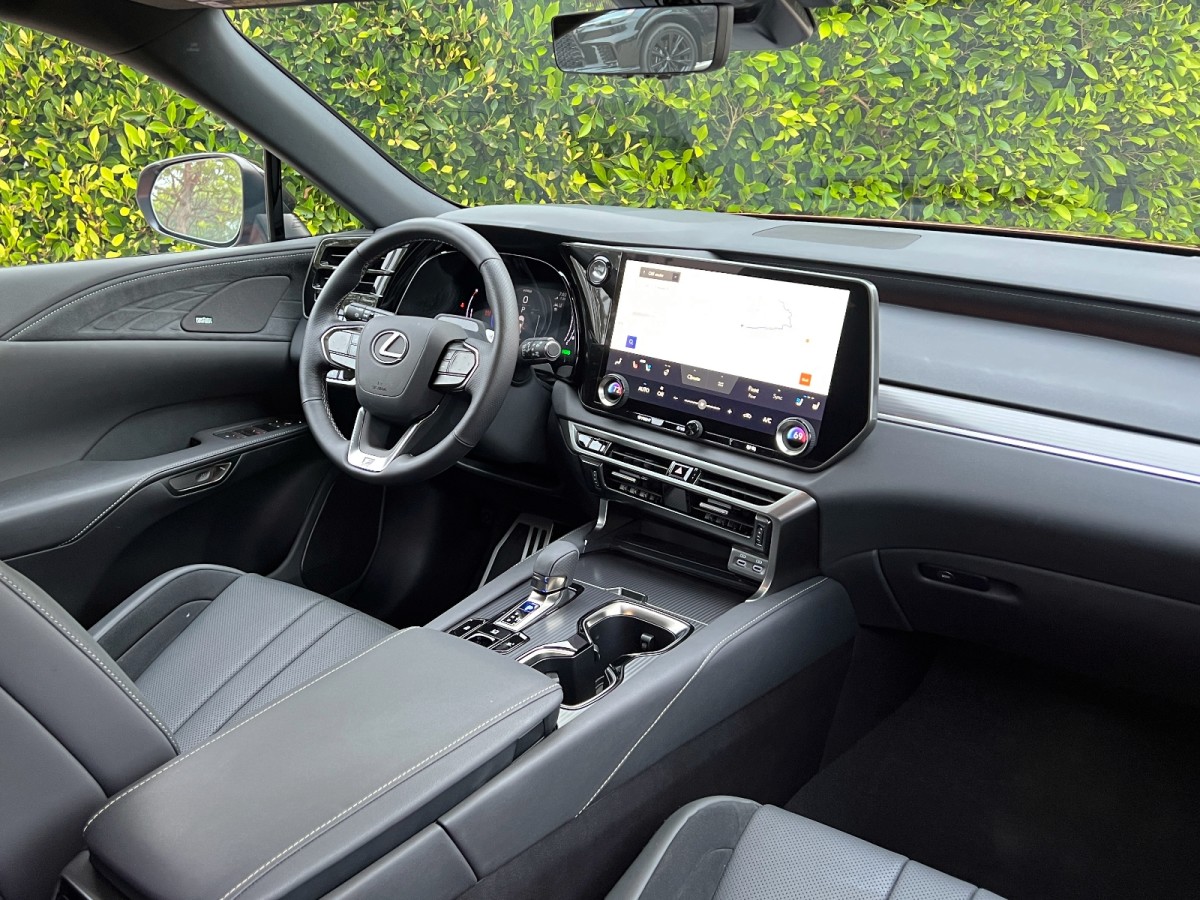 The RX 500h F Sport Performance model’s front seats offer eight-way power adjustment and larger side bolsters, so you’re more aware of them while seated in the vehicle. The leather is the standard grade, which isn’t a bad thing, but it isn’t as good as a semi-aniline hides available in the RX 350h Luxury that we drove. The RX 500h does have standard heated and ventilated front seats and an effective climate control system, plus a thicker F Sport steering wheel that we preferred to grip.