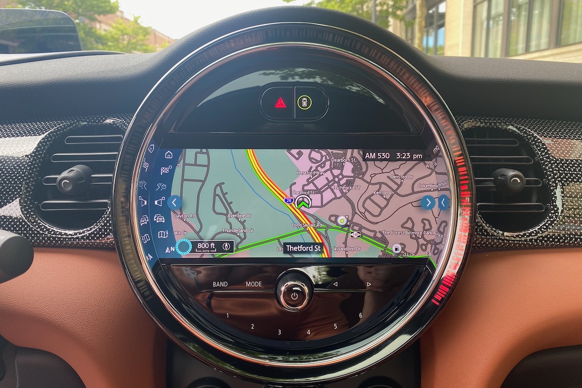 The infotainment system uses reskinned BMW iDrive software that’s several versions old. The home screen can show the map and music side by side. Settings are easy to adjust. But if you’re used to the slick interface and incredible features in any new BMW, you won’t find them in a new MINI. What the Cooper does have is an Openometer (tracking how long the convertible top stays open, down to the minute), a “checkup” that shows a MINI with sunglasses on it, and cartoonish sounds and chimes.