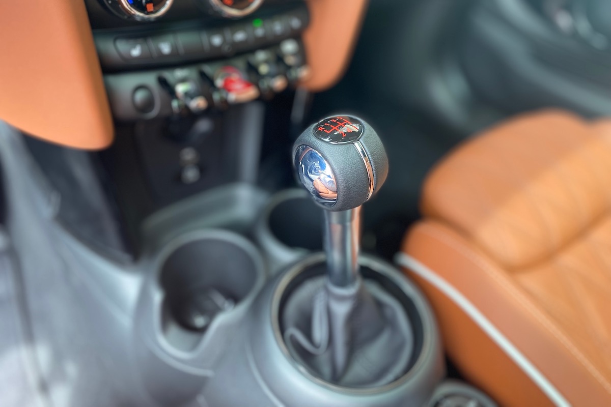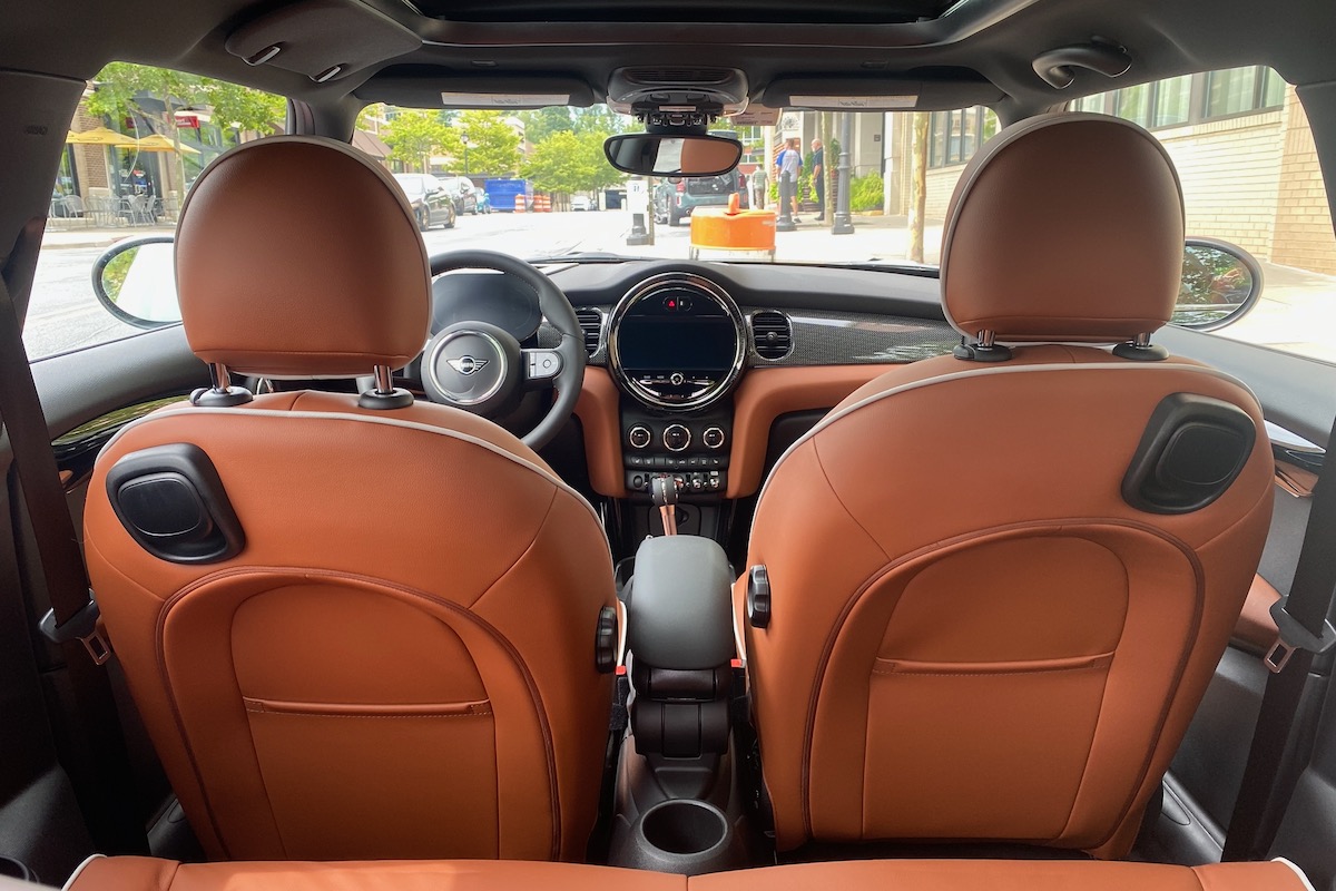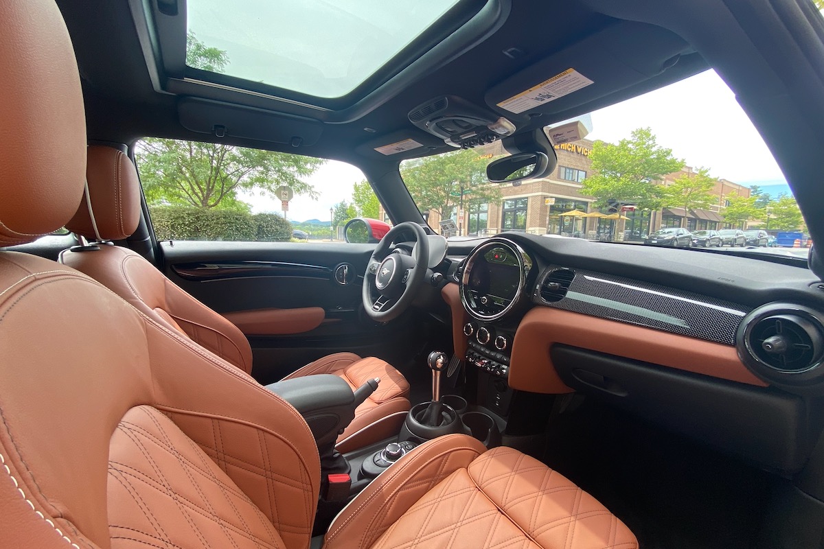 Our test car’s interior was only slightly more grown up, sporting Chesterfield leather seats, a classic saddle tan upholstery with diamond-patterned double stitching and white piping. The seats are sculpted and very supportive. The giant circle on the dash with its inset touchscreen is like a ship’s porthole, while the toggle switches above and below, separated by metal loops, resemble old soundboards. The best analog connection, though, is the long manual gear shifter and clutch pedal, a setup MINI offers on multiple Cooper trims. Fit, finish, and quality are high. The interior may be abstract, but it never feels cheap.