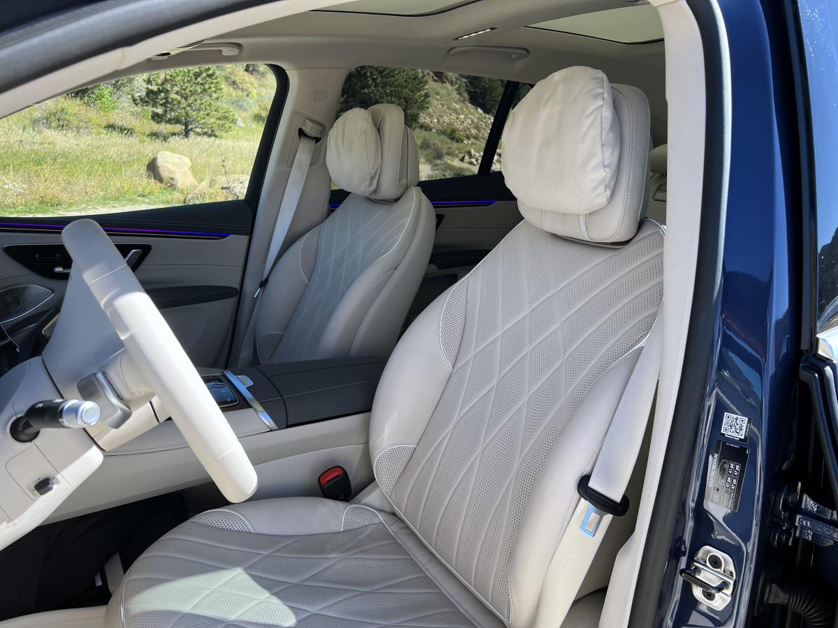 Also included are Mercedes's Digital Light feature that allows you to safely keep your high beams on at night without blinding oncoming traffic. It accomplishes this by automatically blocking a section of the lights to create a lighting void where the approaching car is. The standard Exit Warning enhances safety when parked by warning occupants of approaching vehicles to avoid opening a door into traffic. In our time with the EQS SUV, we never experienced any false alarms and the adaptive cruise control smoothly adjusted the vehicle's speed, maintaining a consistent gap to cars in front.