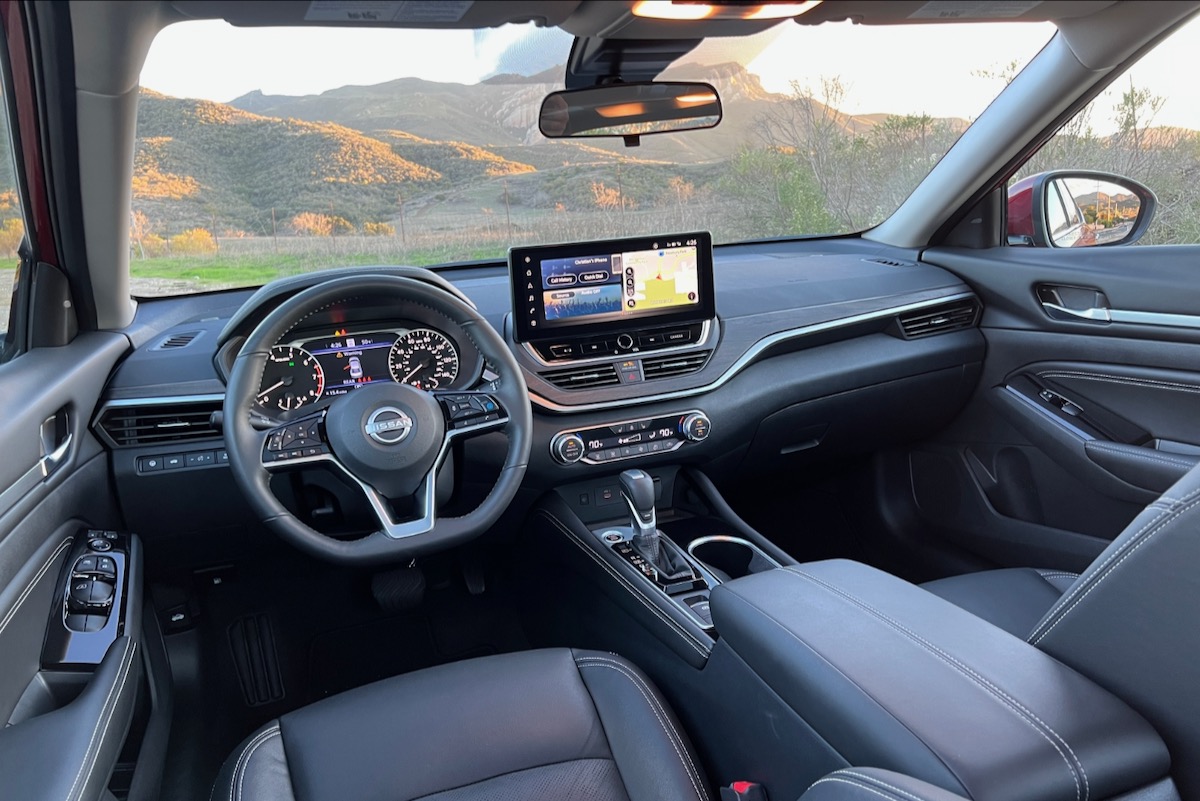Overall, the 2023 Altima looks good, in part thanks to the new, if vulnerable, alloy wheels. The interior is appealing, too, though plenty of hard plastic reminds you that the Altima remains a mainstream sedan. The new simulated wood dashboard trim isn’t fooling anyone, though the new double-stitched seams help distract your attention from the amount of hard plastic inside of this car.