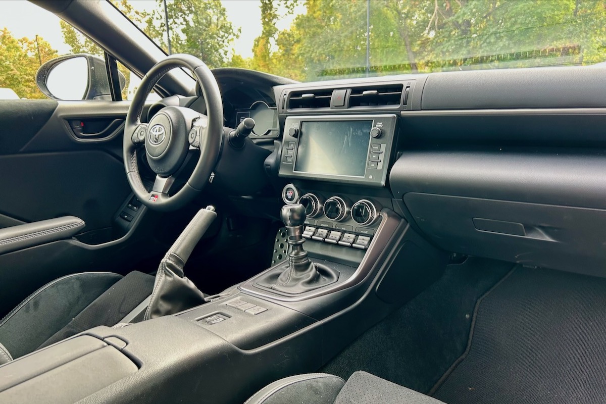At the centre of the dash, the GR86 features a standard 8-inch touchscreen display that runs a dated yet intuitive infotainment system. Some more tech-savvy car shoppers might deride the GR86’s touchscreen as being old and clunky, but it’s perfect for a driving enthusiast who just wants the bare-bones modern infotainment system and to be able to focus on the road ahead.