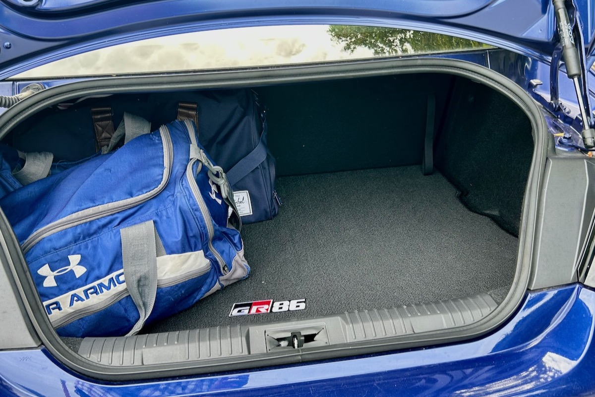 The GR86 provides a paltry 178 litres of cargo space. It’s enough for two weekend bags. If you need any more space than that, you can use the rear seats for added storage. It’s a better use for that back row versus cramming an adult back there. If you are in a pinch, you can slide both of the front seats forward and the GR86 will be able to hold up to four passengers. These seats are fine for small children as well. If you have large items, the rear seatback folds down, allowing for expanded storage space. You could theoretically store two golf bags in the GR86.