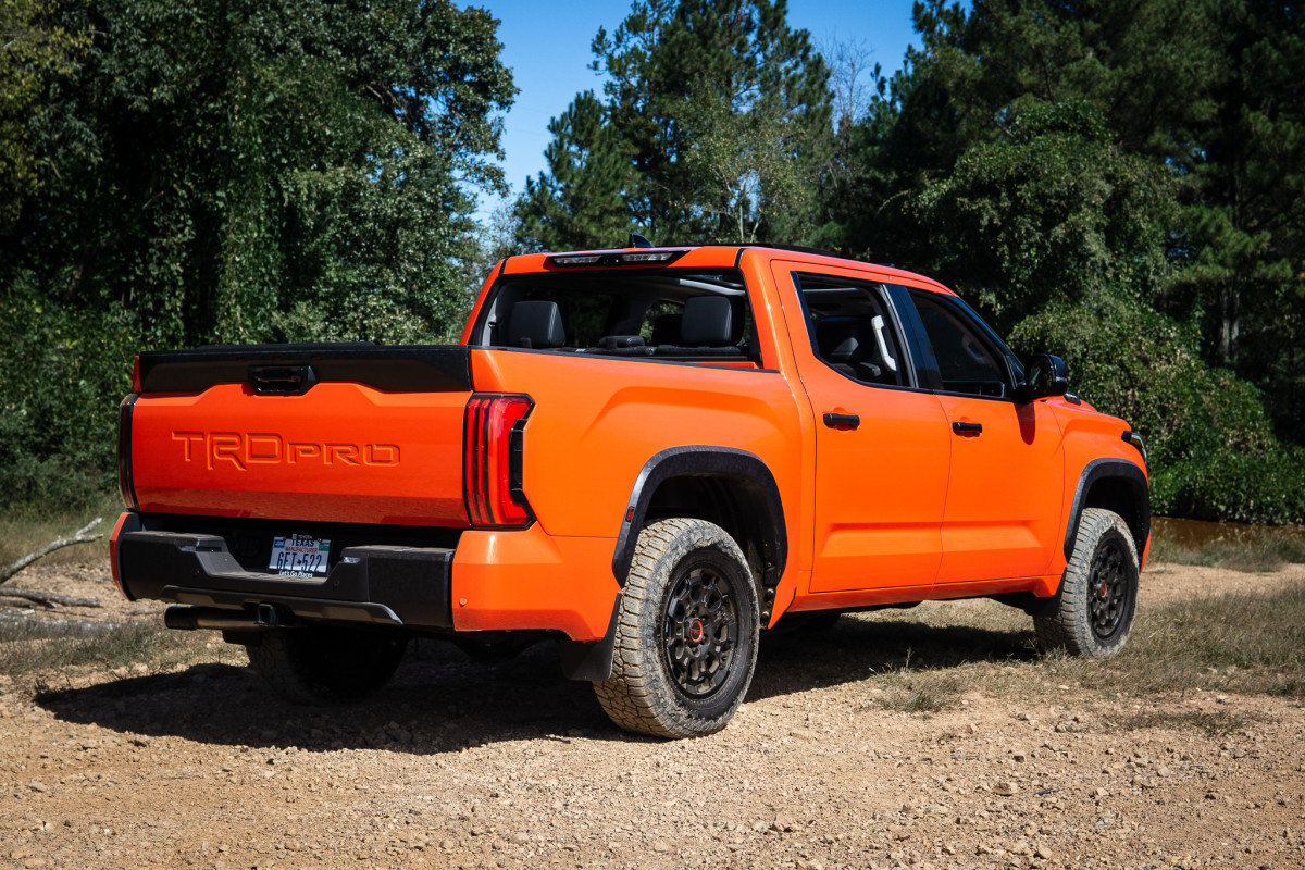 The TRD Pro trim level isn’t cheap, either, but it fills something of a no man’s land in the performance truck segment. At $82,620, it’s significantly more than a Ford F-150 Tremor (starting at $73,995), but it’s less than a Silverado ZR2 (starting at $87,503). It doesn’t offer nearly the speed performance of a Ford F-150 Raptor or the Ram 1500 TRX, but it doesn’t cost nearly as much, either. Mercifully, the TRD Pro comes with few options—only the tow mirrors and our Solar Octane paint cost extra.