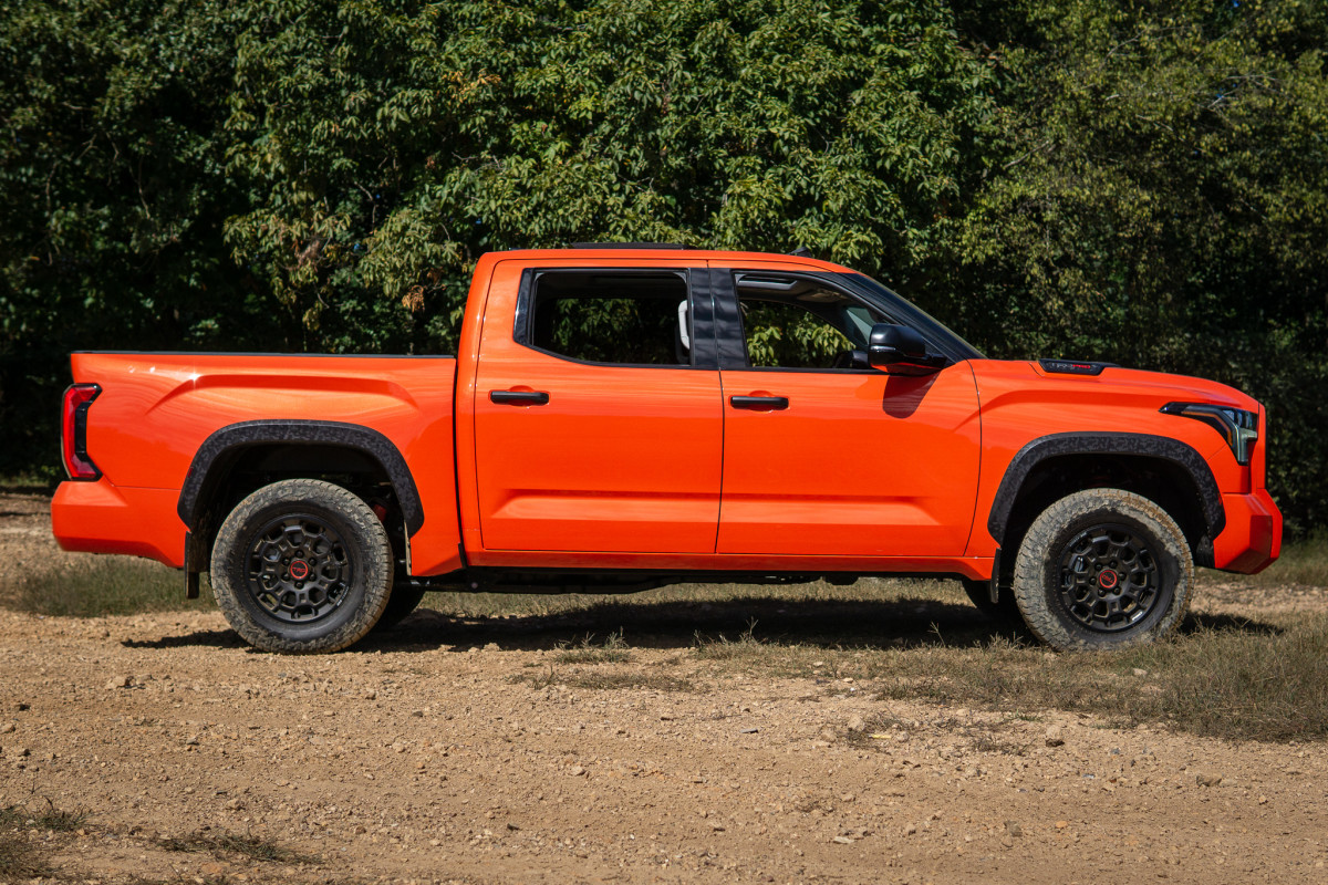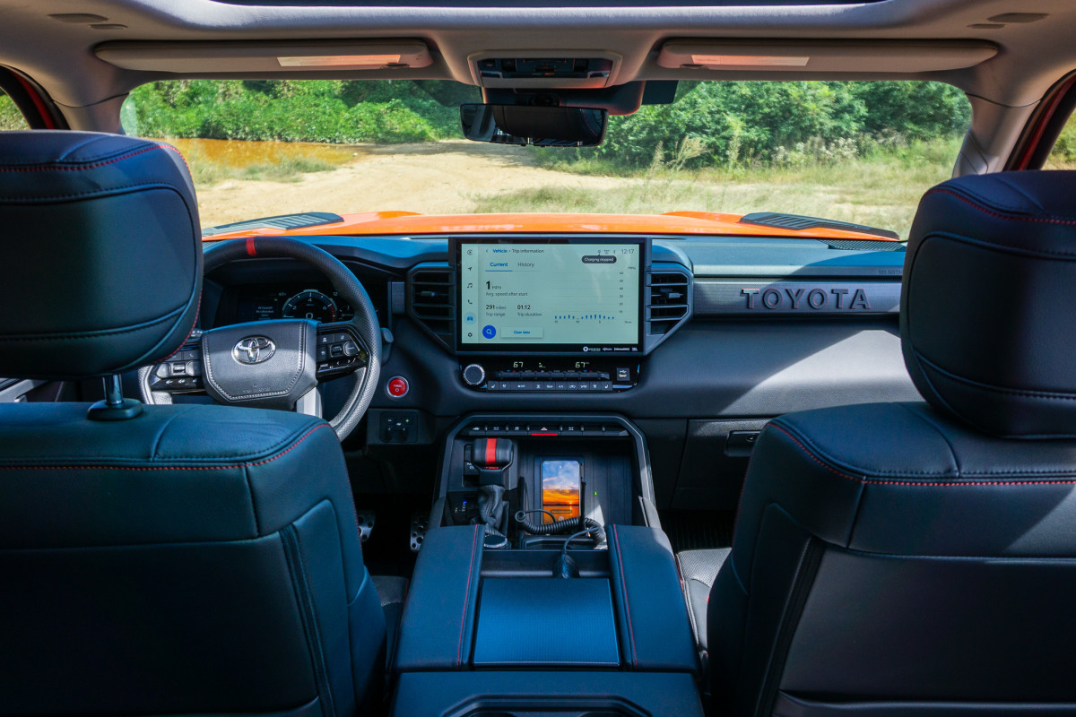 We gave a Tundra TRD Pro a test drive, painted Solar Octane (orange, to us). A black interior is the only choice when you paint a Tundra this colour, but Ice Cap (white), Black, and Gray Tundras can be optioned with red Softex leather upholstery.
