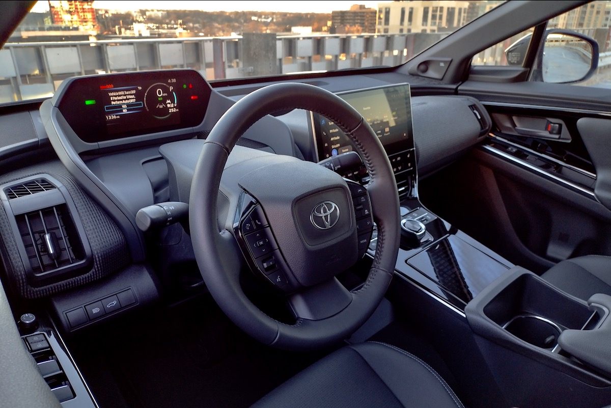 The bZ4X also has a number of ergonomic quirks, starting with the steering wheel. Toyota offers a steering yoke rather than a conventional wheel in other markets, and the placement of the instrument cluster seems to have been done with that in mind. We found that the top portion of the steering wheel blocked the lower half of the instrument cluster in our ideal driving position, although this might not be an issue for taller drivers.