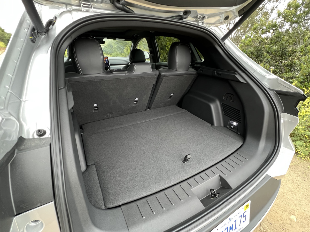 With a standard wireless charging pad, large cupholders and a moderately sized centre armrest bin, there's an adequate amount of storage space for your personal items. The cargo area behind the rear seats, however, is quite a bit smaller than what you'd expect of an SUV this size. Capacity is limited to 376 litres, which is half as much as some of its rivals. The rear seats do fold flat to the cargo floor and increase capacity to 1,373 litres. There's also a small 76-litre tray in the front trunk (or “frunk”) that could be useful for a charging cable.