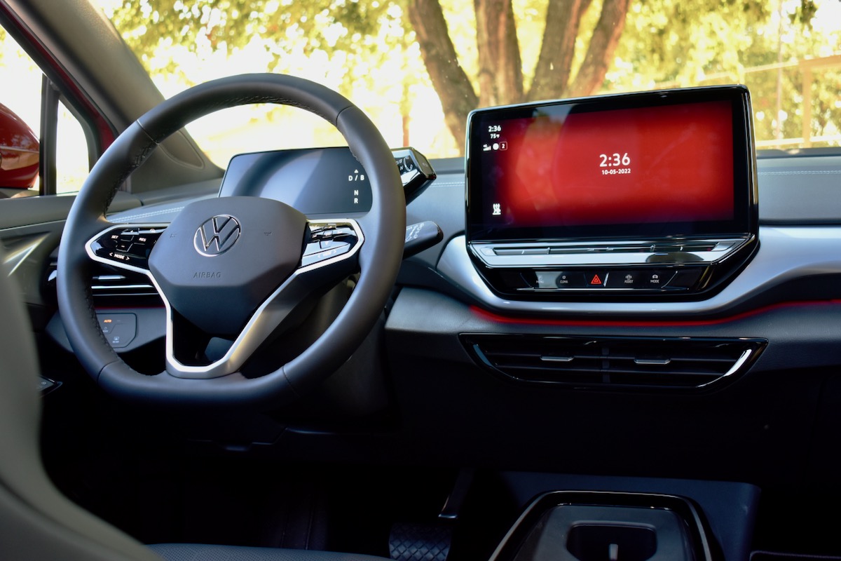 The interior carries over the best qualities from recent VW gasoline-car interiors, including a minimalist design and an overall feeling of quality. That trickles down to the base ID.4 model which, aside from a manual driver’s seat, didn’t seem like much of a downgrade from the higher-level ID.4 Pro AWD we spent most of our driving time in. Leatherette upholstery with seat and door-panel inserts made partly from recycled fibres are standard for 2023.